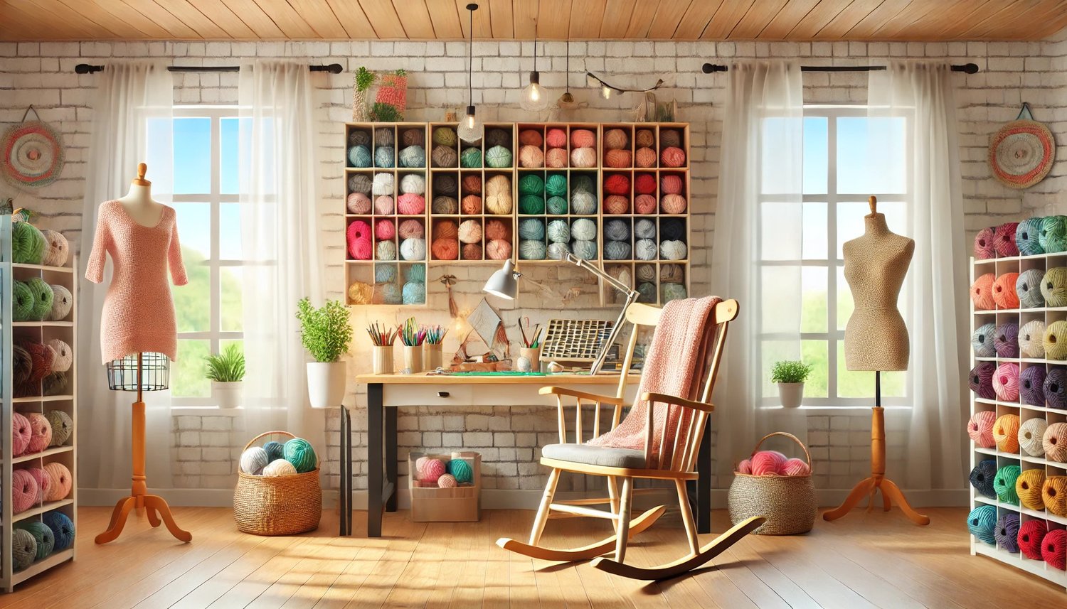 This bright and cozy craft room boasts an open floor plan with colorful yarn cubbies lining the walls. A comfortable rocking chair adds charm, while the crafting table is stocked with tools and crochet supplies, ready for the next project. Large windows with sheer curtains let in ample natural light, creating a cheerful and vibrant atmosphere. The welcoming design makes this room an inspiring workspace and an excellent choice for a virtual meeting background.